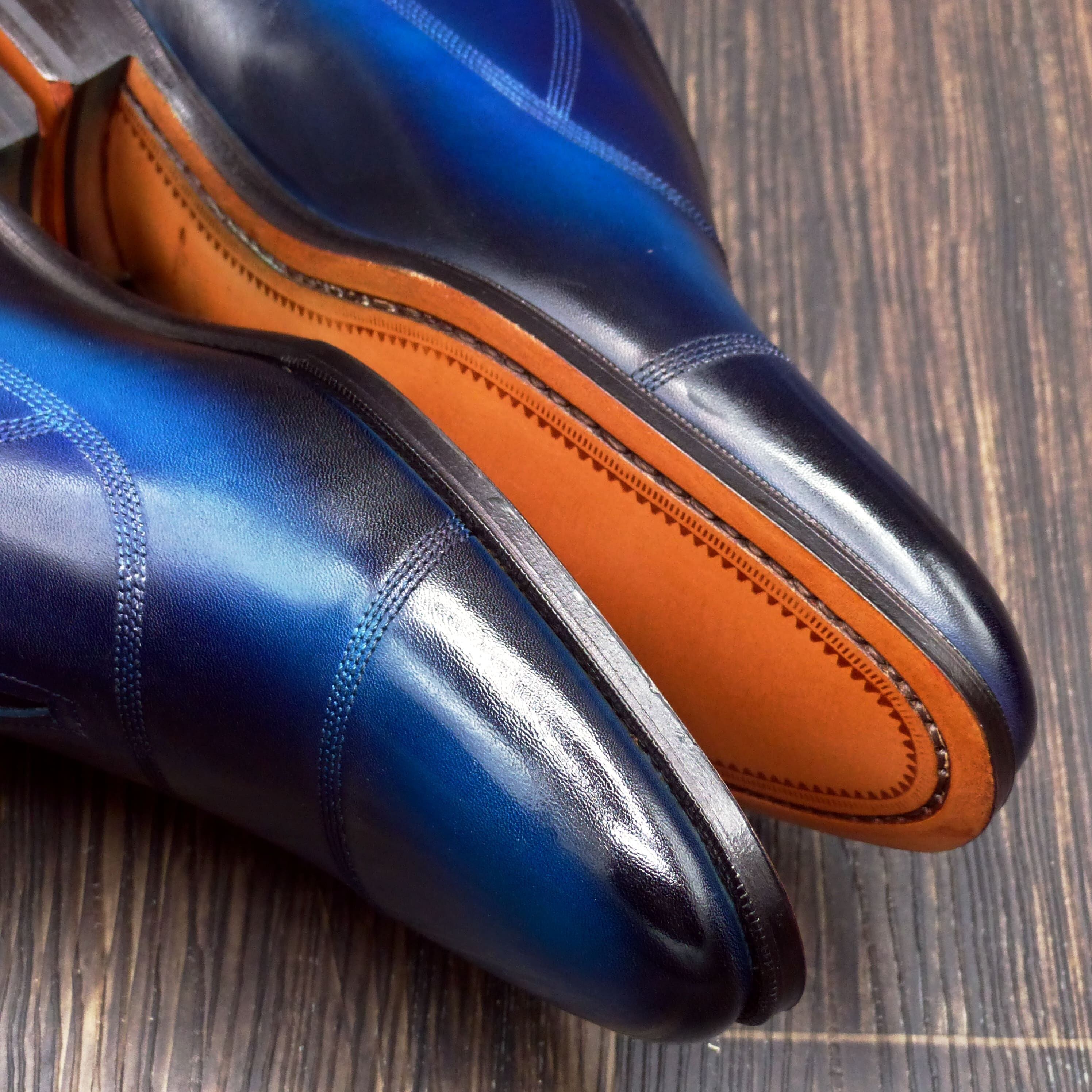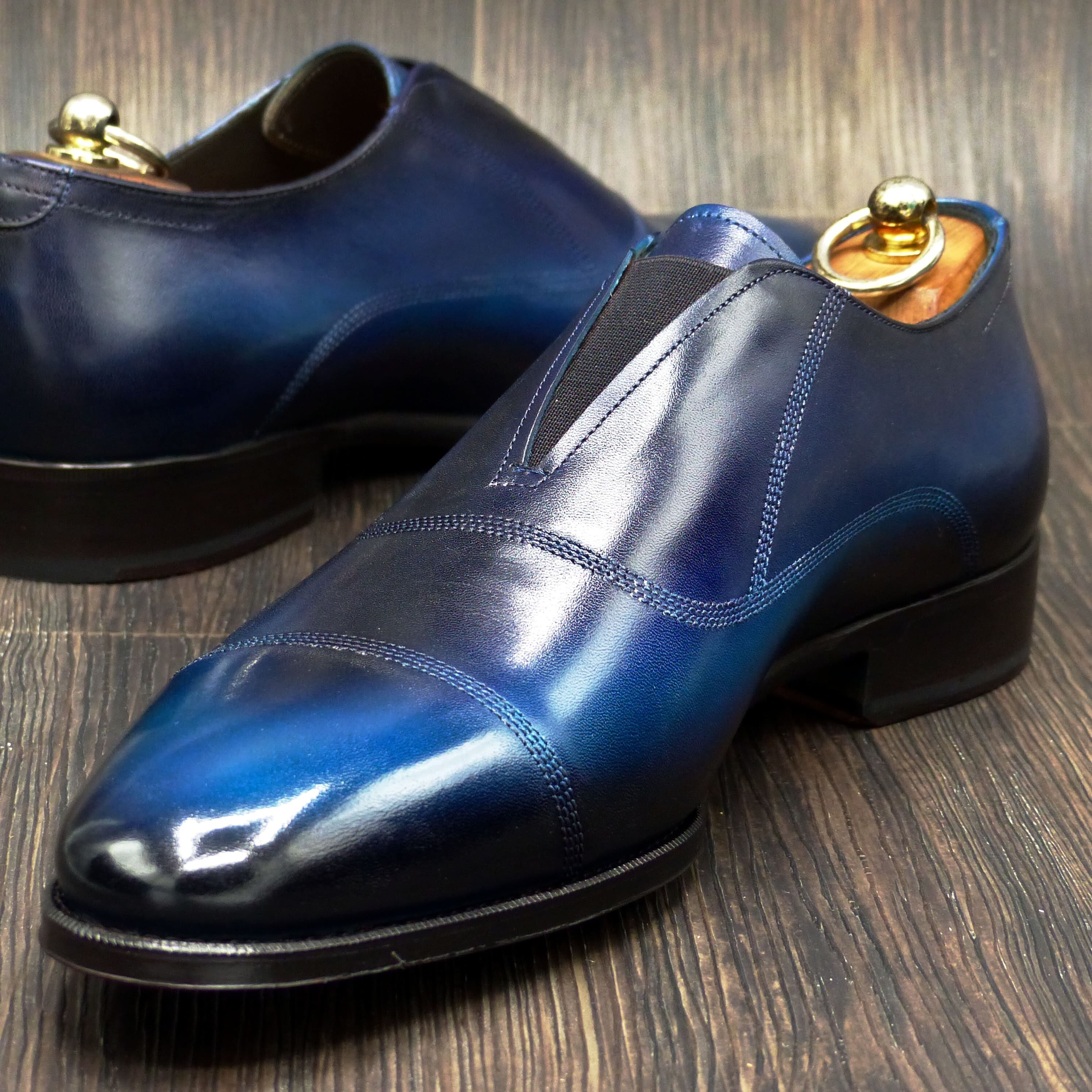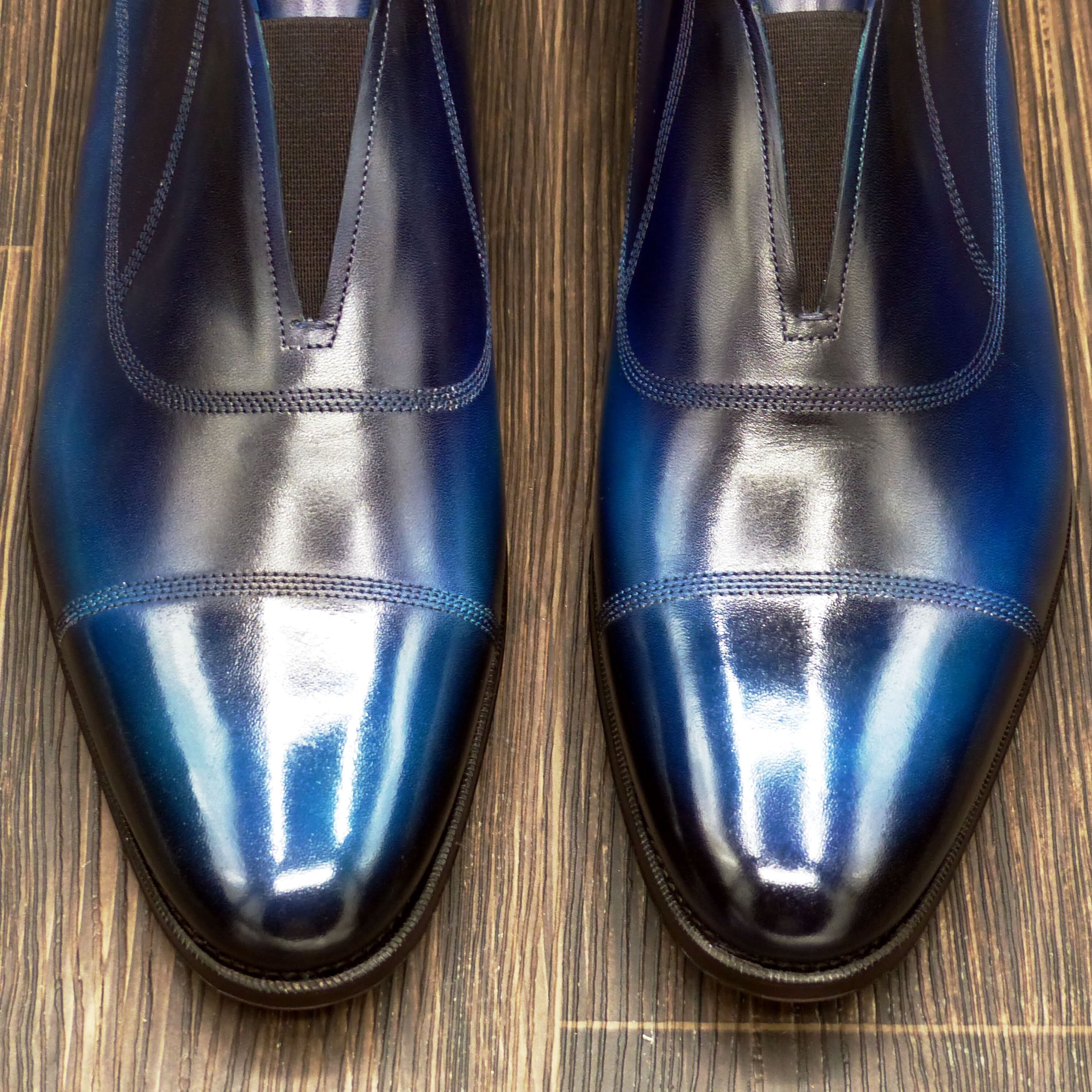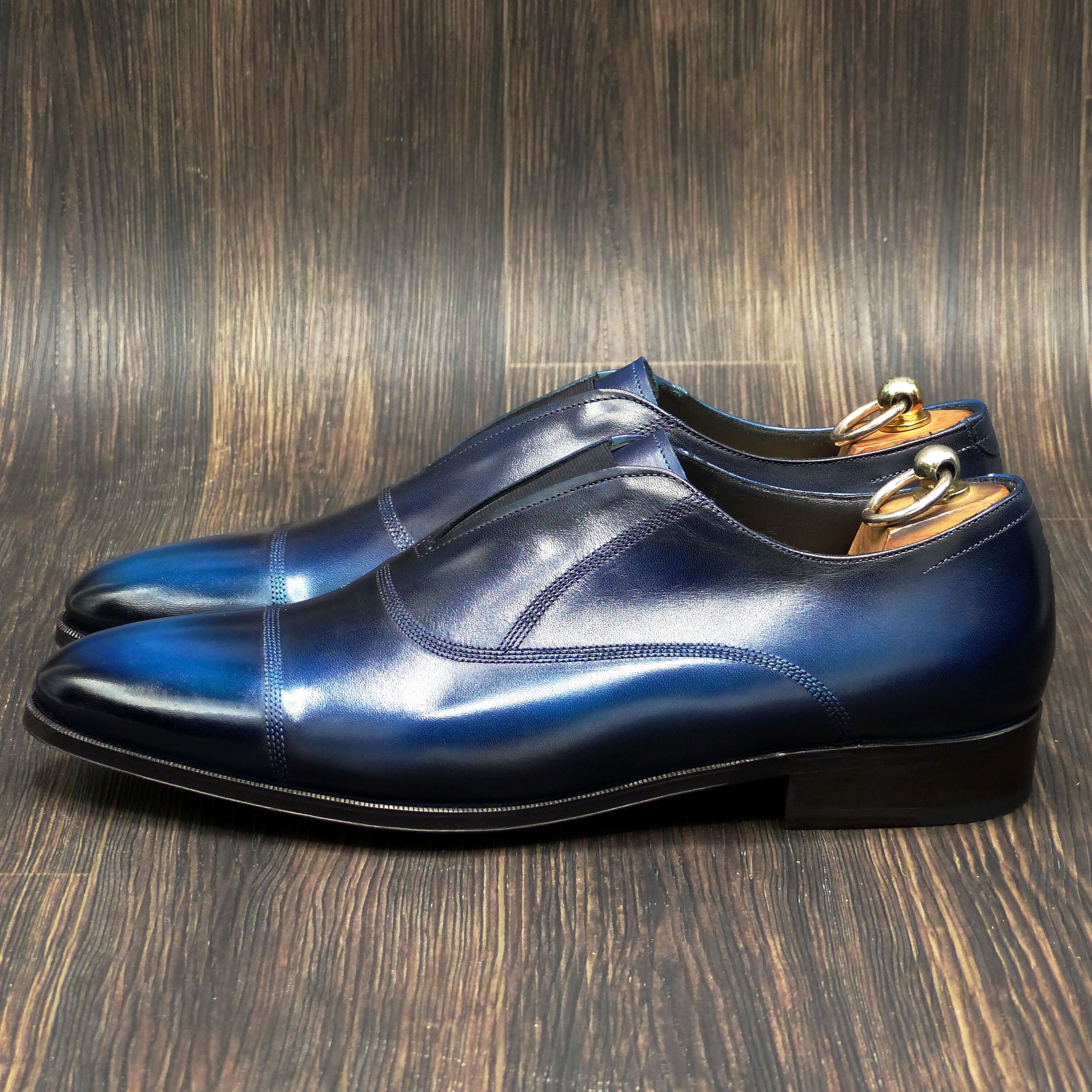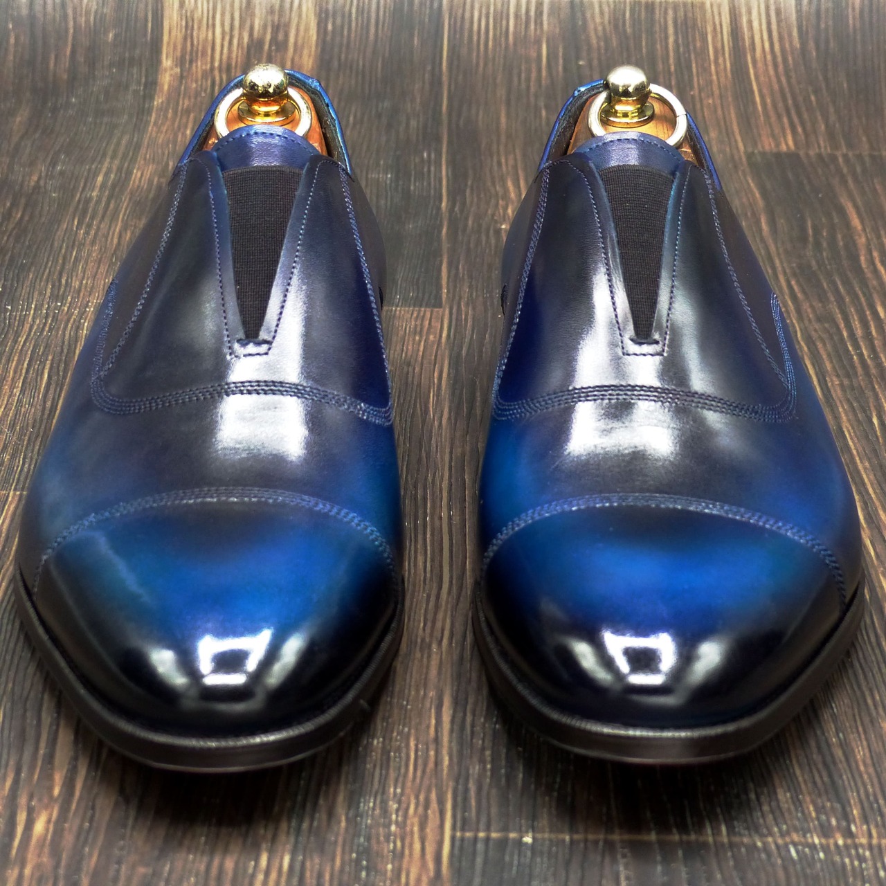 このスリッポンタイプのレザーシューズは、日本の伝統色である「瑠璃色」「群青」「黒藍」をモチーフに、職人の手で丁寧に染め上げたグラデーションパティーヌが特徴です。