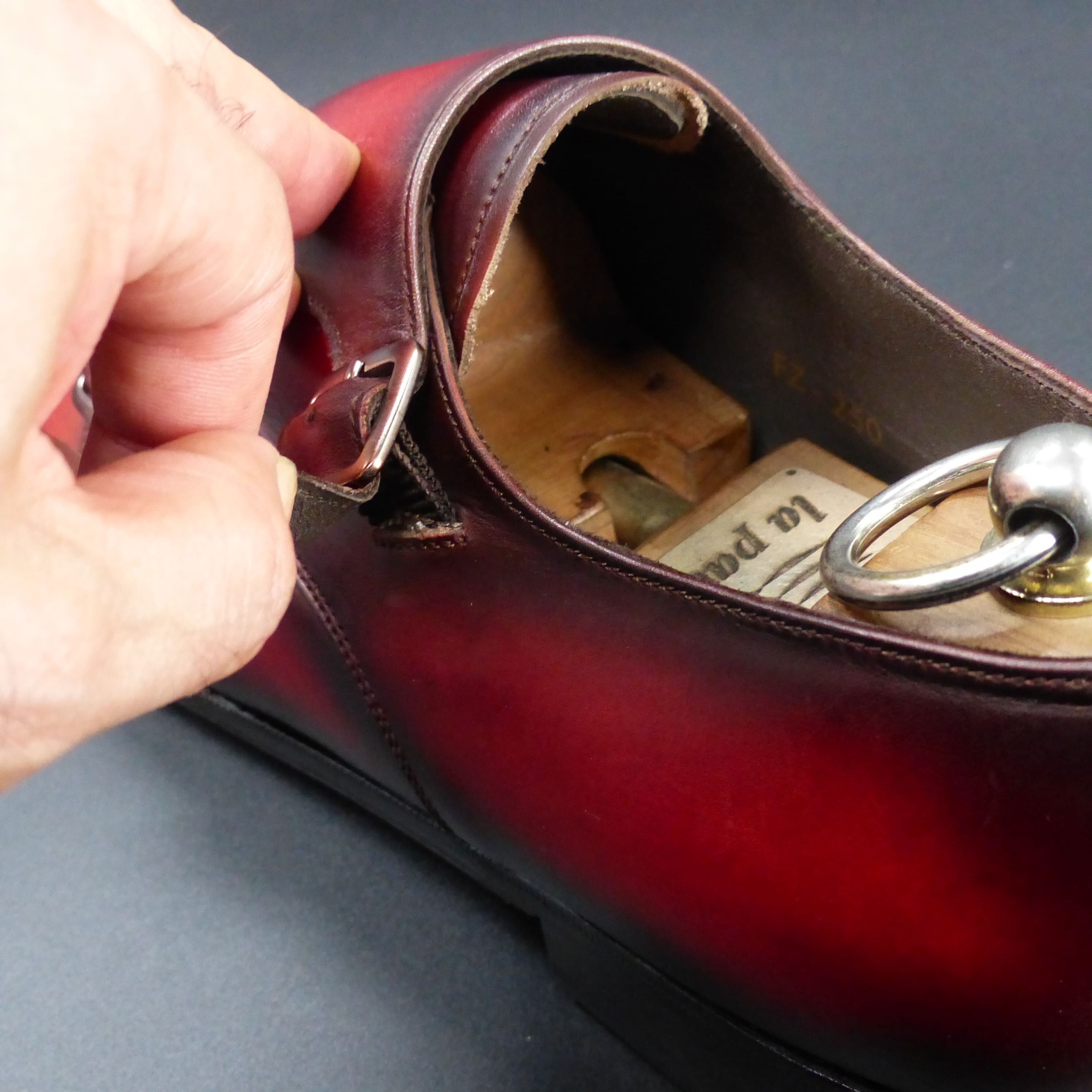 4)シューケア用品を使用する際は、必ず目立たない部分でお試しいただき、その後ご使用ください。また、お客様自身の作業によって生じた色落ちなどについては、弊社では保証できかねますので、ご注意ください。