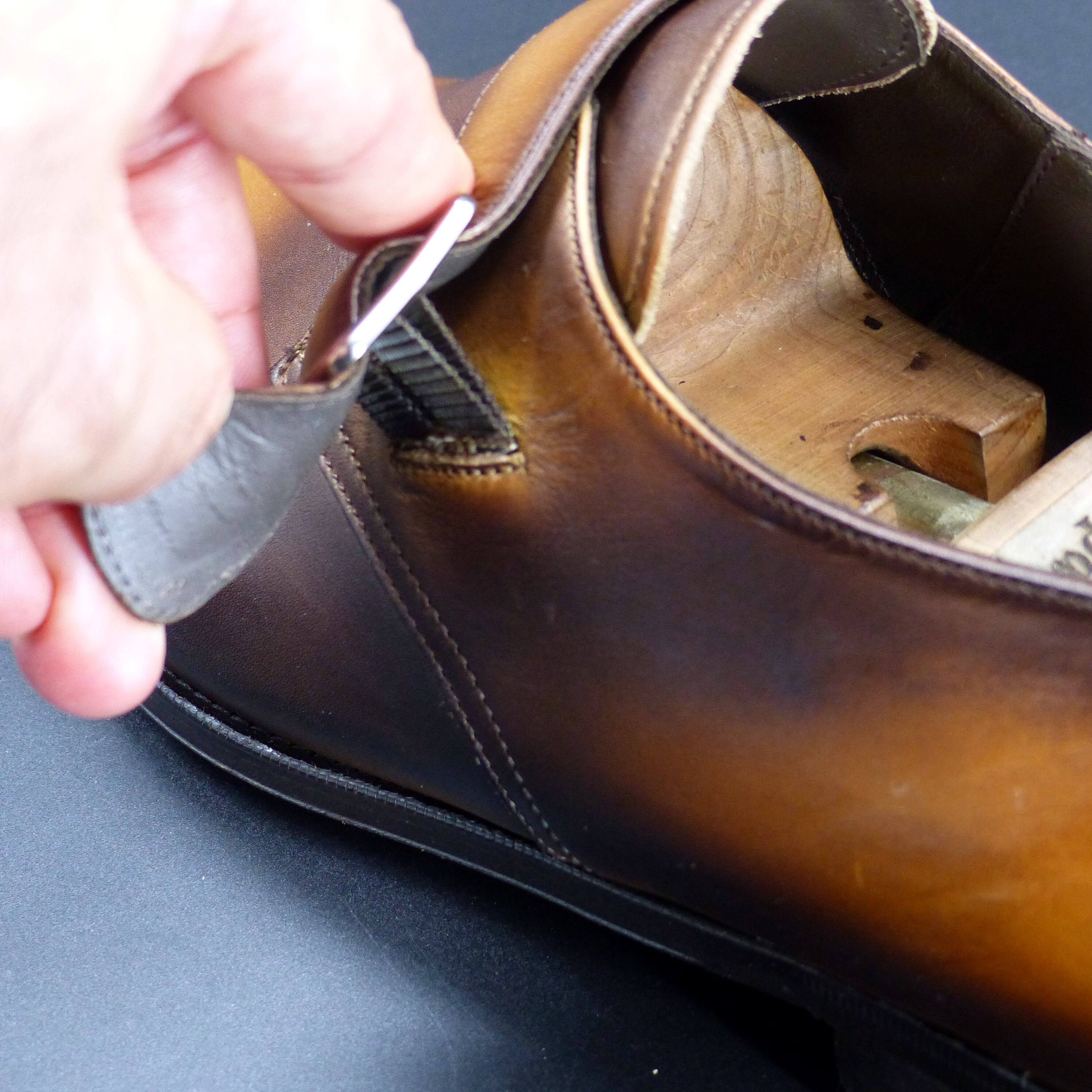 4)シューケア用品を使用する際は、必ず目立たない部分でお試しいただき、その後ご使用ください。また、お客様自身の作業によって生じた色落ちなどについては、弊社では保証できかねますので、ご注意ください。